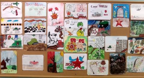 Юные художники изобразили на своих рисунках вечный огонь — символ памяти, солдат – освободителей — защитников Родины, белых голубей — посланников мира и победный салют — радость 1945 года.