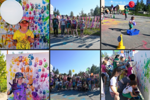 Ребята с азартом участвовали в конкурсах «На самокатах» на быстроту, «Попади в цель» на меткость, «Горошенки цветные» на ловкость. А самые маленькие гости в восторге рисовали ладошками, создавая большой разноцветный холст. Их яркие отпечатки превратились в пестрый ковёр радости.