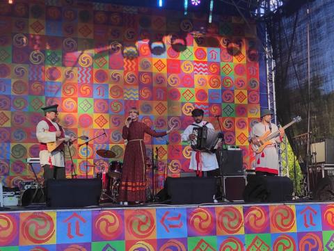 Ансамбль «Валенки» МБКДУ «Туруханский РДК» представил Туруханский район на одной из самых красочных и популярных площадок фестиваля – Обрядовой поляне. «Валенки» исполнили колоритную концертную программу известных народных песен: «Выйду на улицу», «Однажды морем я плыла», «Ухарь-купец», «Ой, то не вечер», «Любо, братцы», «Крутится-вертится», «Самара-городок», «В лунном сиянии», «Валенки». В молодом, перспективном коллективе четыре ярких незаурядных участника – руководитель и баянист Логинов Дмитрий, вокалист и балалаечник Посохин Вадим, бас-гитарист и вокалист Захарчук Андрей, солистка Логинова Алена. Вовлеченность в фестивальную жизнь дала нашим исполнителям возможность обсуждения важных социально-культурных тем, обмен опытом, общение с гостями и полное погружение в разнообразие мировых этнических традиций.