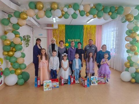 Они поздравили выпускников, родителей и педагогов с окончанием учебного года и вручили каждому будущему первокласснику набор школьника и сладкий подарок.