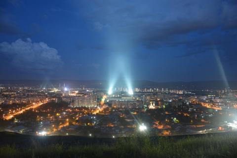 Световое шоу пройдёт на двух площадках – стадионе «Локомотив» и Центральном стадионе. Прожекторы будут освещать небо с 21:50 до 22:05.