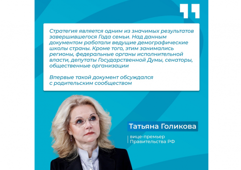 Как отметила вице-премьер РФ Татьяна Голикова, ключевыми направлениями станут укрепление института семьи, продвижение в обществе традиционных духовно-нравственных ценностей.