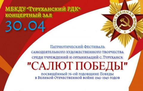 30 апреля в Туруханском районном Доме культуры пройдёт патриотический фестиваль самодеятельного художественного творчества «Салют Победы», посвященный 76-ой годовщине Победы в Великой Отечественной войне 1941-1945гг. Начало мерориятия в 18.00.