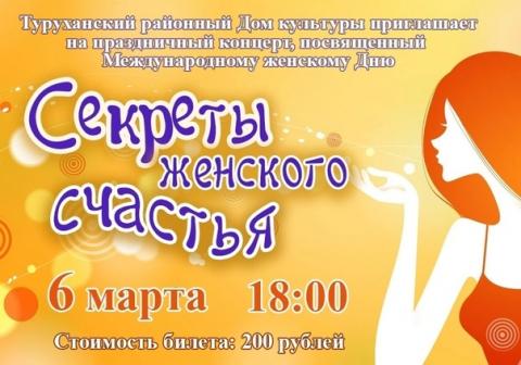 В Туруханском районном Доме культуры запланировано праздничное мероприятие Сегодня в 18:00 состоится концерт «Секреты женского счастья».