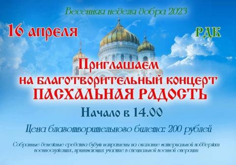 Мероприятие состоится 16 апреля в 14.00. В концерте примут участие творческие коллективы и исполнители районного Дома культуры, а также Детской музыкальной школы. Кроме того, в рамках пасхального концерта в РДК пройдёт выставка «Ангел моей души». На выставке будут представлены работы студии декоративно - прикладного и изобразительного искусства «Жар - птица». Начало работы выставки в 13.00.