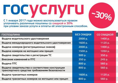 В соответствии с изменениями в Налоговый кодекс РФ, вступившими в силу с 01.01.2017 года, граждане смогут получить скидку 30% на оказание государственных услуг ГИБДД - регистрацию транспорта или оформление водительского удостоверения. Воспользоваться скидкой могут исключительно пользователи Единого портала Госуслуг, произведя оплату после подачи предварительной заявки в личном кабинете на Интернет-сайте WWW.GOSUSLUGI.RU.
