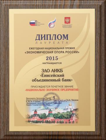 К награде в 2015 году были представлены 82 предприятия России и лишь только один банк. Именно этим банком является ЗАО АИКБ «Енисейский объединенный банк».