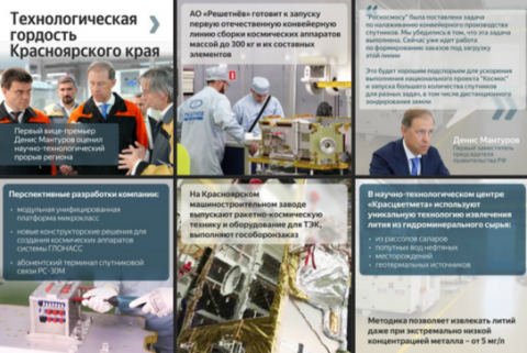 Первый вице-премьер Денис Мантуров в ходе рабочей поездки вместе с губернатором Михаилом Котюковым и главой «Роскосмоса» Дмитрием Бакановым посетил АО «Решетнёв». Здесь создали первую в России поточную линию конвейерной сборки спутников массой до 300 кг.