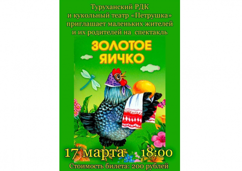 Образцовый кукольный театр «Петрушка» приглашает детей и взрослых на новый спектакль-сказку Показ состоится 17 марта в Туруханском районном Доме культуры в 18:00. Стоимость билета: 200 рублей.