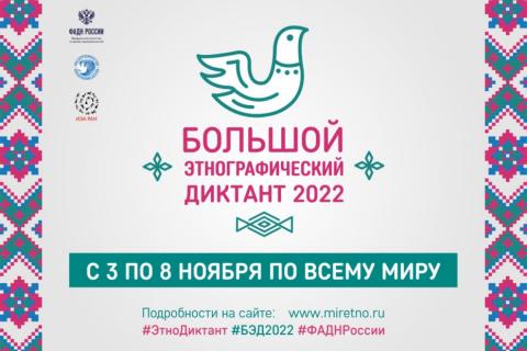 VIII Международная просветительская акция "Большой этнографический диктант" состоится в онлайн формате в период с 3 по 8 ноября 2022 года. Чтобы стать участником, необходимо зайти на сайт miretno.ru и нажать на кнопку «Пройти диктант». Проходя диктант, вы сможете оценить свои этнокультурные знания о нашей стране, а также поближе познакомиться с культурой народов, проживающих в России. Результаты диктанта будут подведены в День Конституции Российской Федерации - 12 декабря.