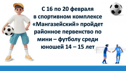 В период с 16 по 20 февраля в Туруханске запланировано проведение районного первенства по мини - футболу среди юношей 14 - 15 лет. Мероприятие состоится в спортивном комплексе "Мангазейский". За победу будут бороться 5 команд из Туруханска, Бора, Игарки и Светлогорска. Открытие соревнований - 16 февраля в 19.00. Приходите, будет интересно!