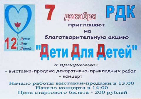 Благотворительное мероприятие состоится 7 декабря в районном Доме культуры. в 13:00 ч. начнёт работу Ярмарка новогодних украшений, в 14:00 ч. запланирована Концертная программа. Цена благотворительного стартового билета 200 рублей. Все собранные денежные средства пойдут на оказание медицинской помощи детям Донбасса. Делайте добро - оно всегда возвращается!
