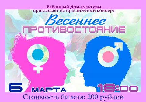 Районный Дом культуры приглашает на праздничную концертную программу «Весеннее противостояние» Мероприятие состоится 6 марта в 18:00. Продажа билетов началась, время работы кассы с 10:00 до 17:00. Стоимость билета: 200 рублей.