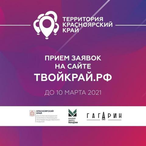 С 15 февраля стартовал прием заявок на участие в весенней сессии краевого инфраструктурного проекта «Территория Красноярский край». Принимаются проекты, способствующие развитию творческой деятельности, добровольчества, патриотического воспитания и подготовки к военной службе, формированию здорового образа жизни. На реализацию проекта выделяется грант до 50 тыс. рублей. Заявленные проекты должны быть реализованы до 10 декабря 2021 года.