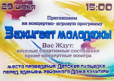Туруханский районный Дом культуры приглашает гостей и жителей села на концертно-игровую программу «Зажигает молодежь!» Мероприятие, посвященное Дню молодежи состоится 29 июня в 15.00 на детской площадке перед зданием Дома культуры.