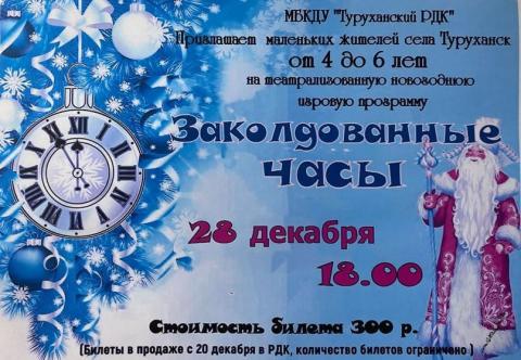 Туруханский районный Дом культуры приглашает детей 4-6 лет на новогоднюю театрализованную игровую программу «Заколдованные часы»