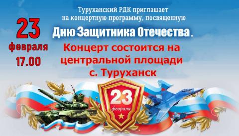 Туруханский районный Дом культуры приглашает на праздничный концерт, посвященный Дню защитника Отечества Мероприятие состоится 23 февраля в 17.00 на центральной площади села Туруханск.