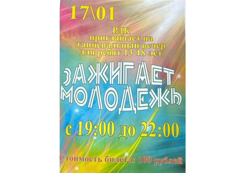 Туруханский районный Дом культуры приглашает ребят 13 - 18 лет на танцевальный вечер «Зажигает молодежь» Мероприятие пройдет 17 января с 19:00 до 22:00. Стоимость билета: 100 рублей.