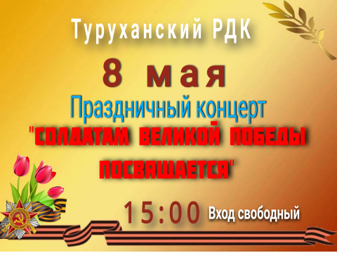- 8 мая в 15:00 в Туруханском районном Доме культуры состоится концерт "Солдатам великой Победы посвящается";