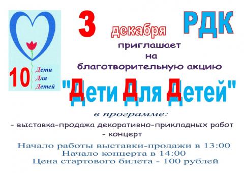 Районный Дом культуры приглашает вас принять участие в благотворительной юбилейной акции «ДЕТИ ДЛЯ ДЕТЕЙ». Акция пройдет 3 декабря в рамках Международного Дня инвалида.