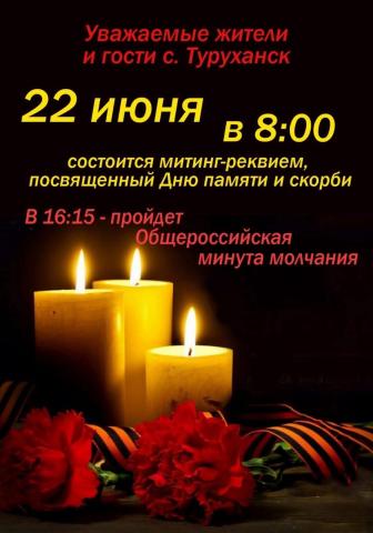 22 июня в Туруханске состоится митинг - реквием, посвященный Дню памяти и скорби Мероприятие пройдет у мемориала Славы героев Великой Отечественной войны 1941 - 1945 гг. в 8.00. В 16.15 в селе пройдет Общероссийская минута молчания.