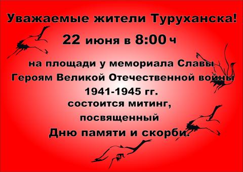 Уважаемые жители Туруханска! 22 июня в 8.00 на площади у мемориала Славы Героям Великой Отечественной войны 1941-1945 гг. состоится митинг, посвященный Дню памяти и скорби.