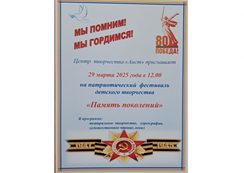 Центр творчества «Аист» приглашает на патриотический фестиваль детского творчества Мероприятие «Память поколений» состоится 29 марта в 12:00. В программе театральное творчество, хореография, художественное чтение и вокал.
