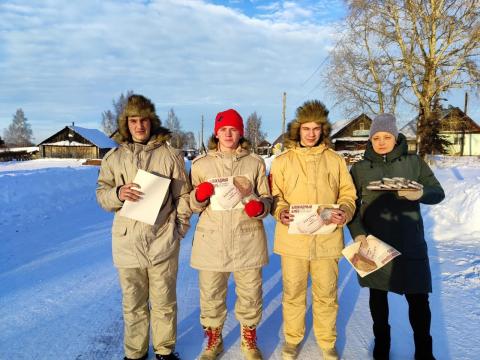 В честь приближающейся 80 - й годовщины полного освобождения Ленинграда от фашистской блокады, ребята вышли на улицы села и раздали информационные листовки о блокаде города, а также кусочек хлеба весом 125 грамм.