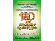 10.12.2024 г. Праздничное мероприятие посвящено 100-летию образования первого учреждения культуры в Туруханском районе. Гости вместе с участниками творческих коллективов районного Дома культуры и Детской музыкальной школы совершат путешествие по ярким страницам культурной жизни района за прошедшие сто лет. Стоимость билета 200 рублей. |