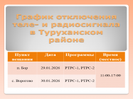 28.01.2026 г. По данным специалистов филиала РТРС «Красноярский КРТПЦ» в Бору профилактика запланирована 29 января, в период с 11:00 до 17:00 часов местного времени. В Ворогово отключение произойдет 30 января с 11:00 до 17:00. В этот промежуток времени возможны кратковременные остановки трансляции 20 цифровых эфирных телеканалов. |