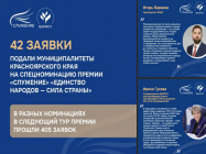 28.01.2026 г. III Всероссийская муниципальная премия «Служение» обрела особую номинацию — «Единство народов — сила страны». Всего за полтора месяца 1 937 представителей муниципалитетов подали заявки на участие в конкурсе по этой номинации. 42 из них — из Красноярского края. В числе заявок есть программы по поддержке национально-культурных автономий, создание центров национальных культур или домов дружбы, разработка и реализация муниципальных программ по укреплению межнационального согласия. |