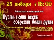 26.01.2024 г. Мероприятие «Пусть наши песни согреют ваши души» состоится 26 января в 18.00. Вход свободный. |