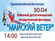 22.04.2022 г. В преддверии празднования 77 – годовщины Победы в Великой Отечественной войне, в Туруханске пройдет районный детско-юношеский патриотический Фестиваль «Майский ветер». Мероприятие состоится 30 апреля в 14.00. Стоимость входного билета: взрослый – 200 рублей, детский – 100 рублей. |